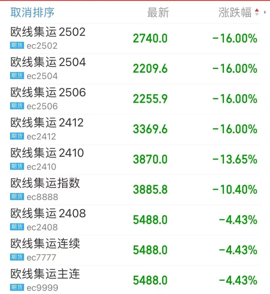 本周四,集运指数(欧线)期货再度大跌,EC2408收跌4.43%至5488点,EC2410跌13.65%至3870点,其余合约盘中全部跌停。