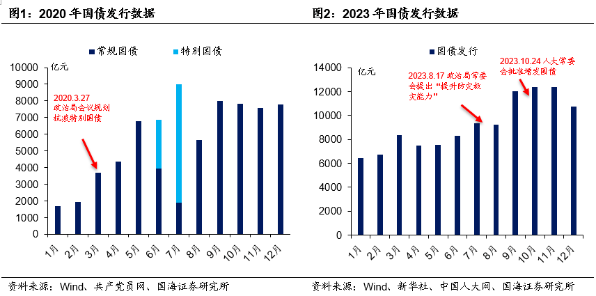 本文将通过归纳总结“2020年1万亿元抗疫特别国债”和“2023年1万亿元增发国债”的发行历程,梳理相关规律,合理猜想本轮超长期特别国债发行的过程。