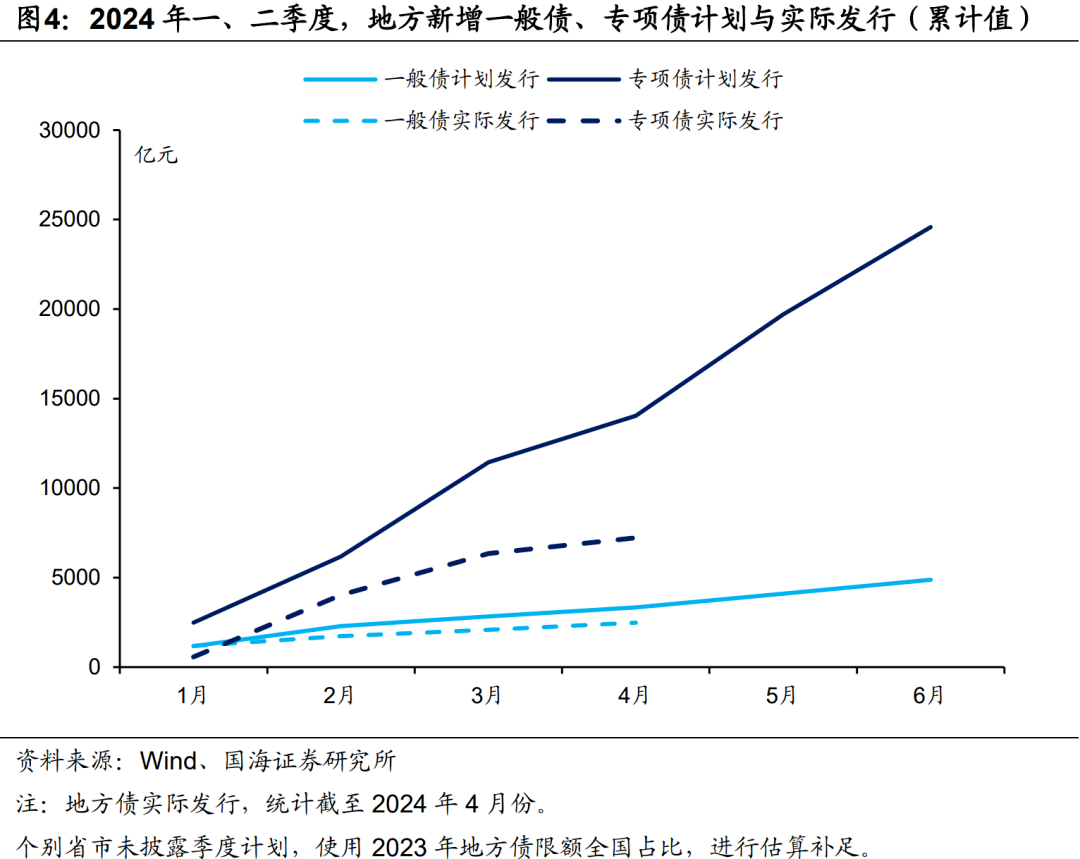 截至2024年4月底,我们统计年内新增专项债实际发行7224亿元,发行进度刚刚超过地方财政一、二季度披露的发行计划的一半,发行进度明显落后(图4)。