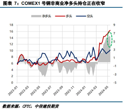 其中,建信期货认为,后市铜价月度级别的上涨还将继续。一方面,是逼仓因素暂未褪去,最新的CFTC持仓报告(5月14日)显示当前基金做多情绪继续增加。同时,虽然COMEX铜相较于LME铜有近400美元/吨的溢价,但在国产铜无COMEX交割品牌、LME铜注册仓单中50%为俄铜以及COMEX限制俄铜注册仓单,从而导致虽然全球总库存量高,但可供COMEX交割的货源少。