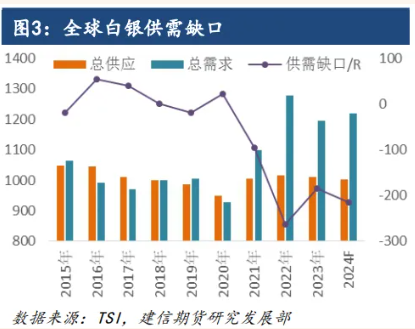 世界白银协会(The Silver Institute)的数据显示,2021年至2023年全球白银连续三年出现供应短缺,且工业需求的回升有望使得2024年全球白银市场出现6673吨供需缺口。